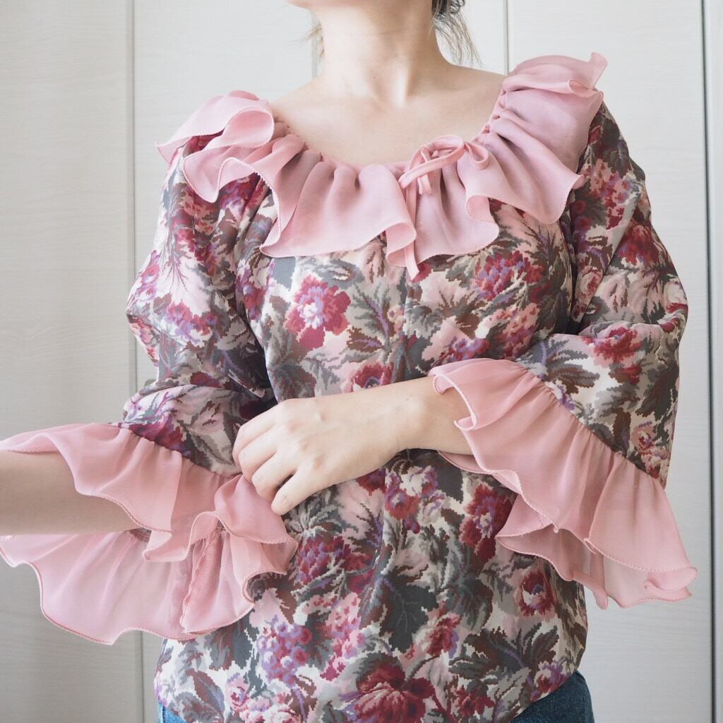 vintage ruffle collar & sleeve floral blouse/ヴィンテージ ラッフル 襟 袖 花柄 ブラウス