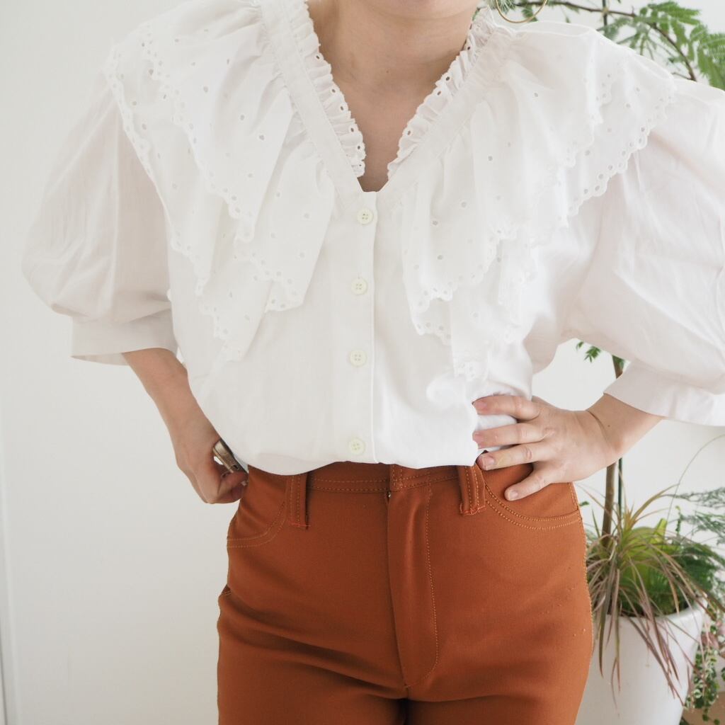 大きなフリル襟がなんとも可愛らしいブラウスです。